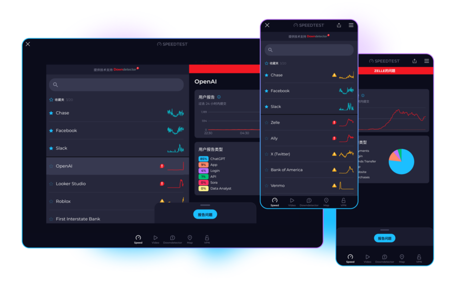 使用 Downdetector(全球最受欢迎的网络中断和连接问题追踪平台)来实时监控并报告您常用服务的问题。